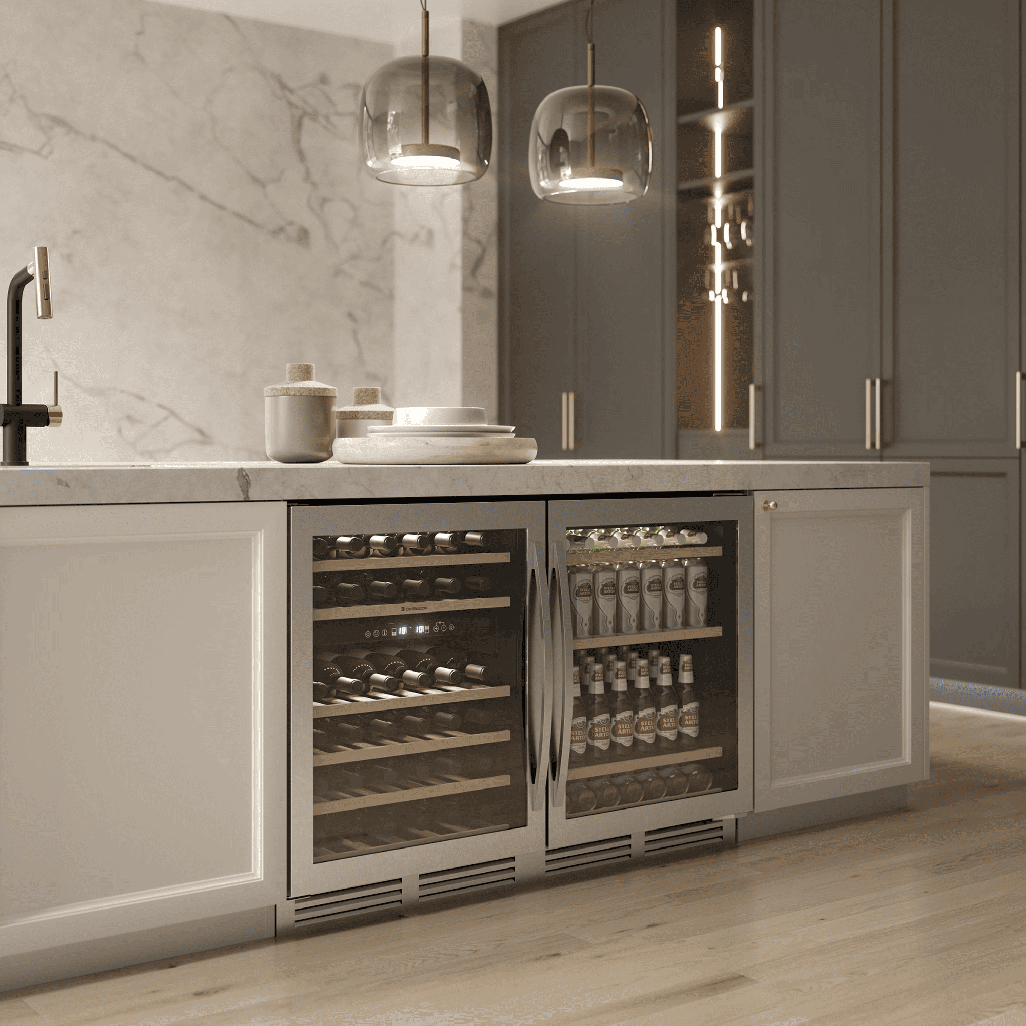 Adega Dual Zone com capacidade para 45 garrafas padrão Bordalesa, duas zonas de temperatura independentes e porta de vidro duplo com moldura em aço inox escovado, ideal para conservar vinhos tintos e brancos em suas faixas de temperatura ideais.