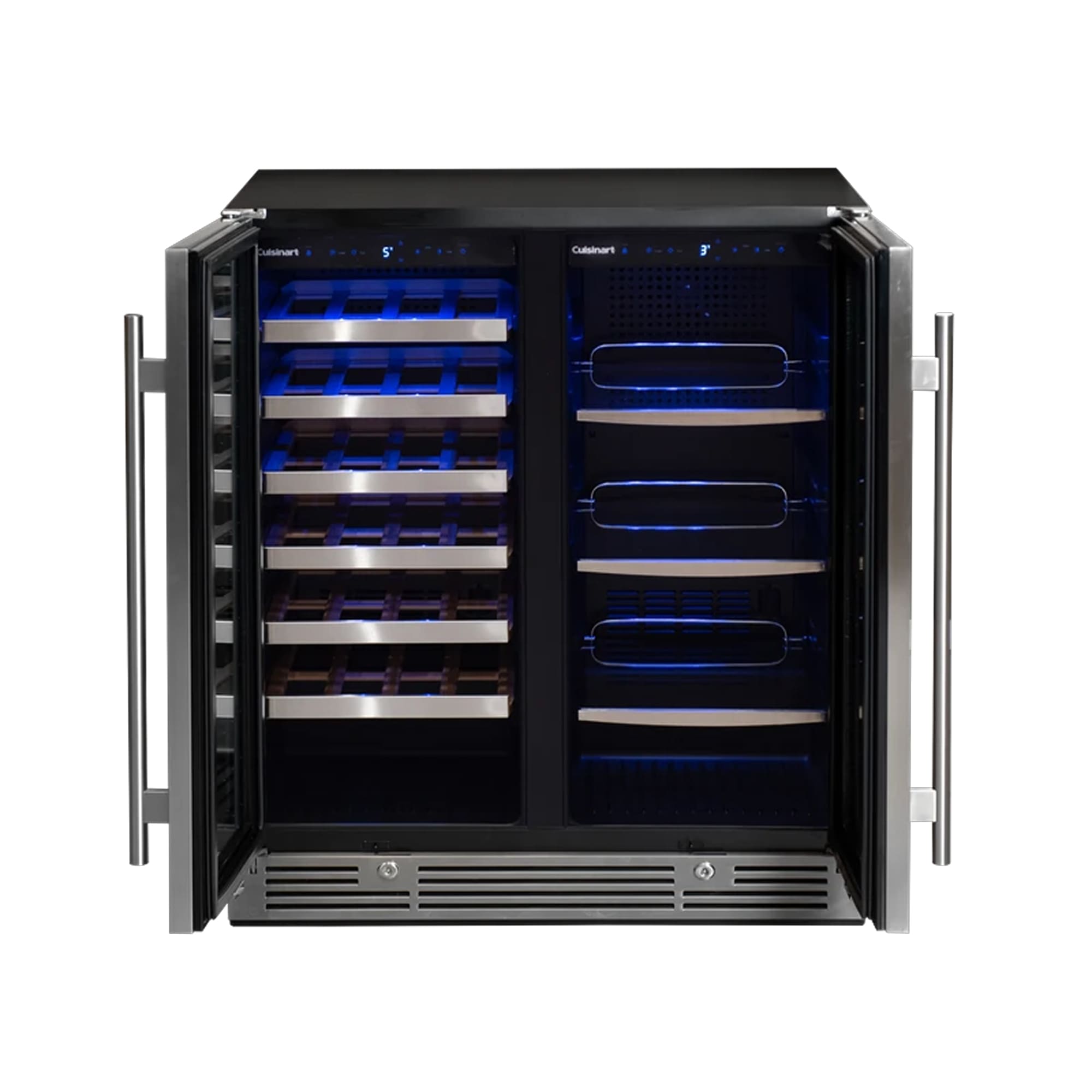 Adega e Beer Center Cuisinart Arkton com grande capacidade interna de 190 L (até 86 latas, 55 long necks e 28 garrafas de vinho) e sistema Dual Zone de controle de temperatura — Beer Center entre -5 °C e 10 °C e Adega entre 5 °C e 18 °C — mantendo bebidas e vinhos sempre nas faixas ideais com design moderno em inox e vidro