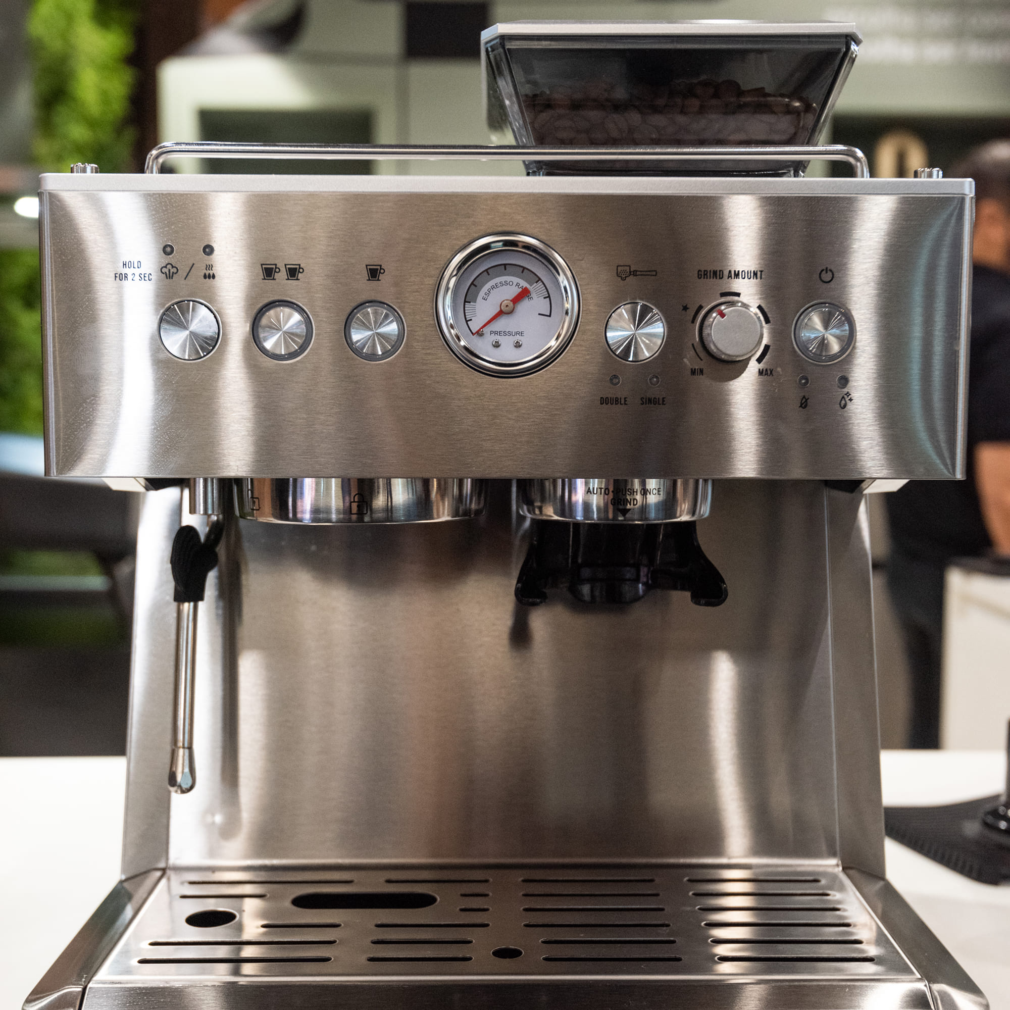 Cafeteira Invita Barista Pro Blend com moedor de grãos integrado, bomba italiana de 15 bar, pré-infusão, espumador de leite e Thermoblock. Ideal para espressos e bebidas cremosas. Disponível em 127V e 220V.