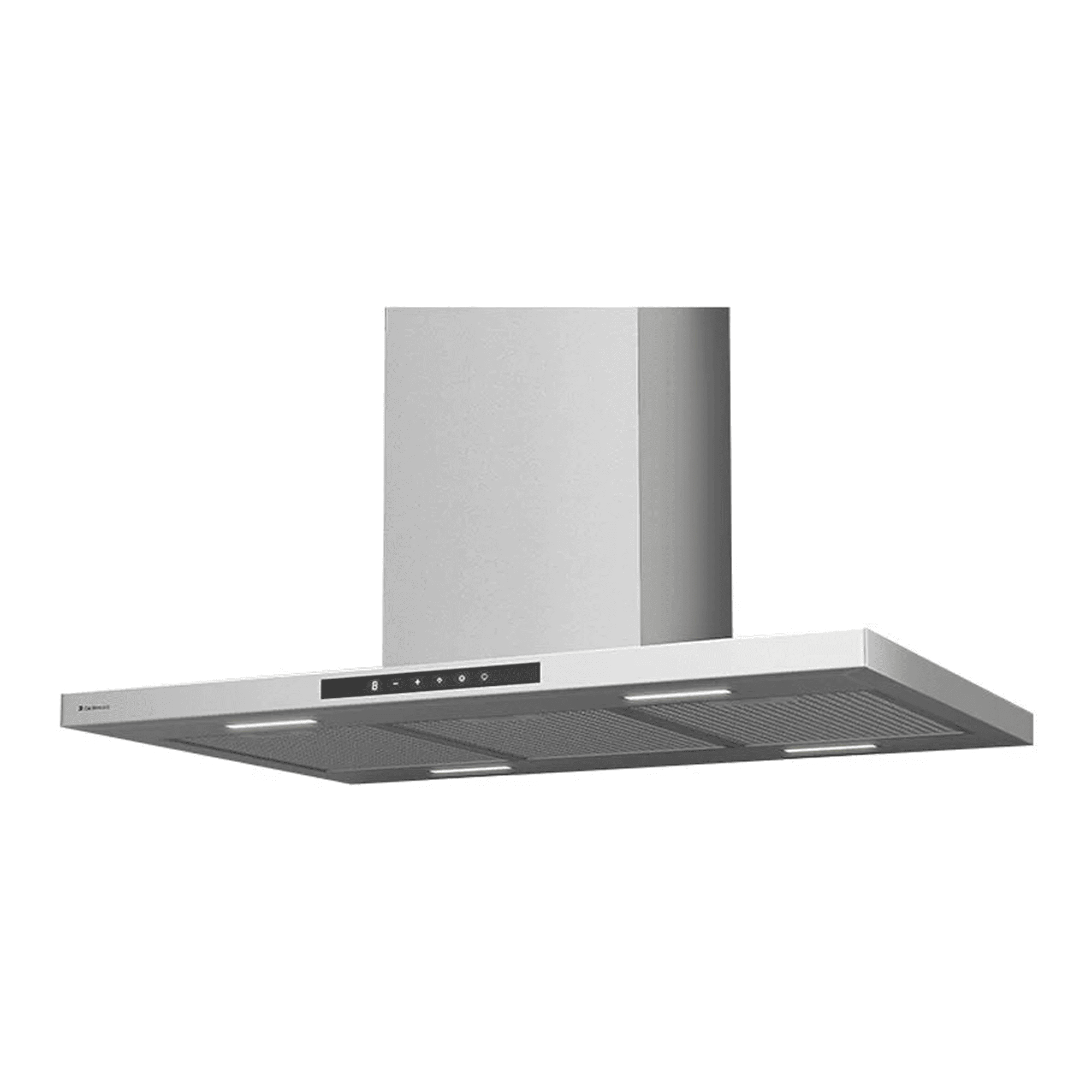 Coifa de ilha em aço inox escovado com painel de comando touch digital, três níveis de sucção, iluminação LED integrada e vazão máxima de até 1000 m³/h, projetada para renovar o ar da cozinha e eliminar fumaça, vapor e odores tanto em modo depuração quanto em modo exaustão.