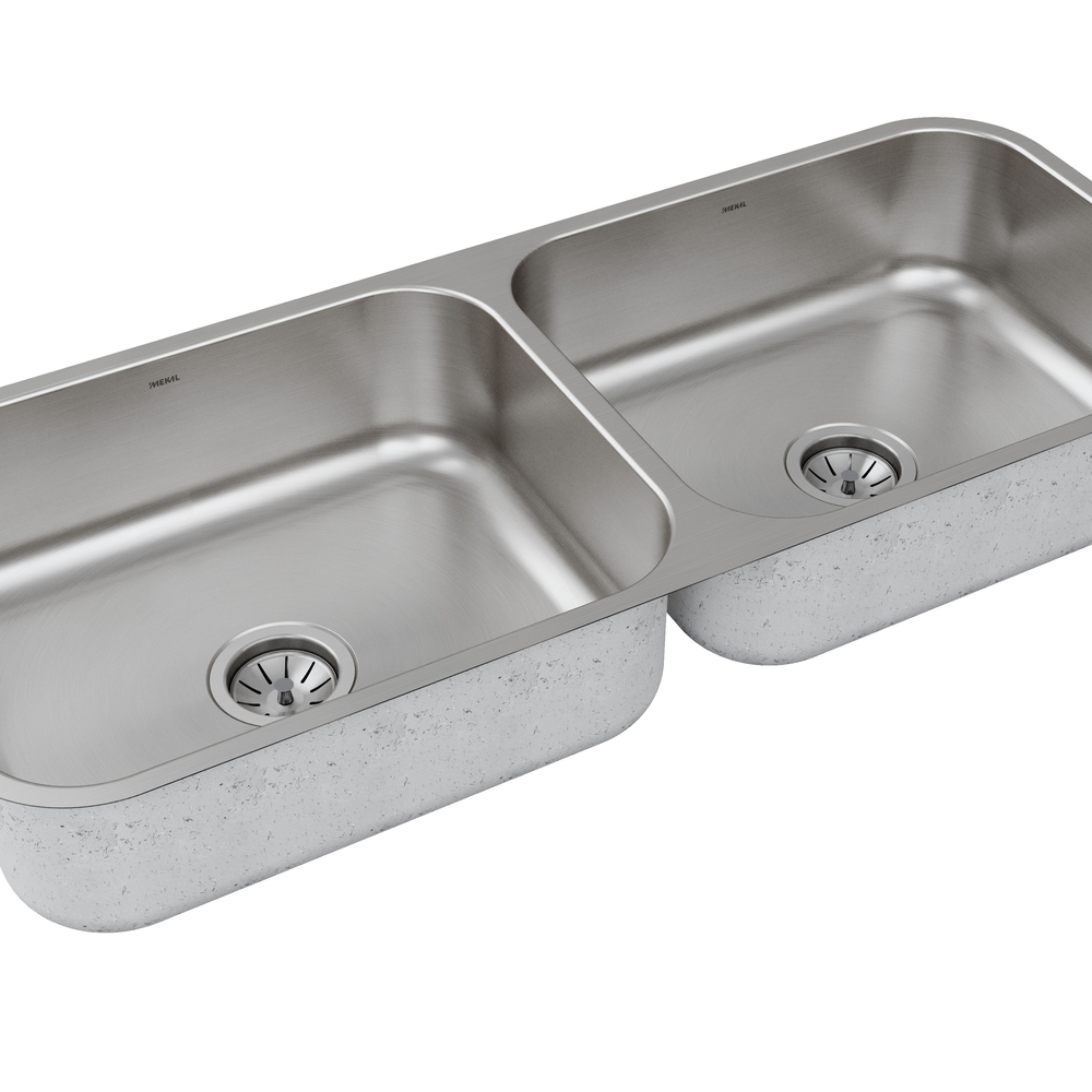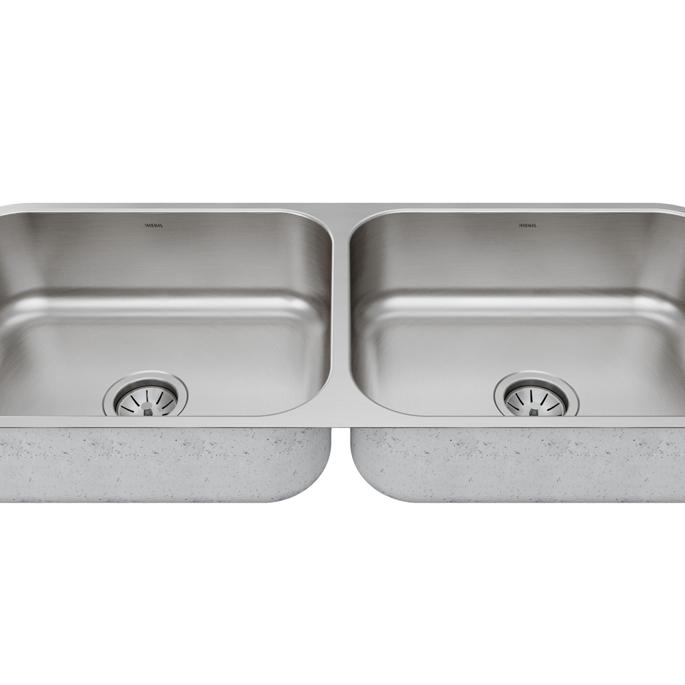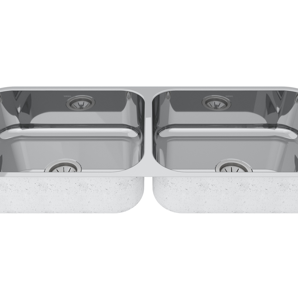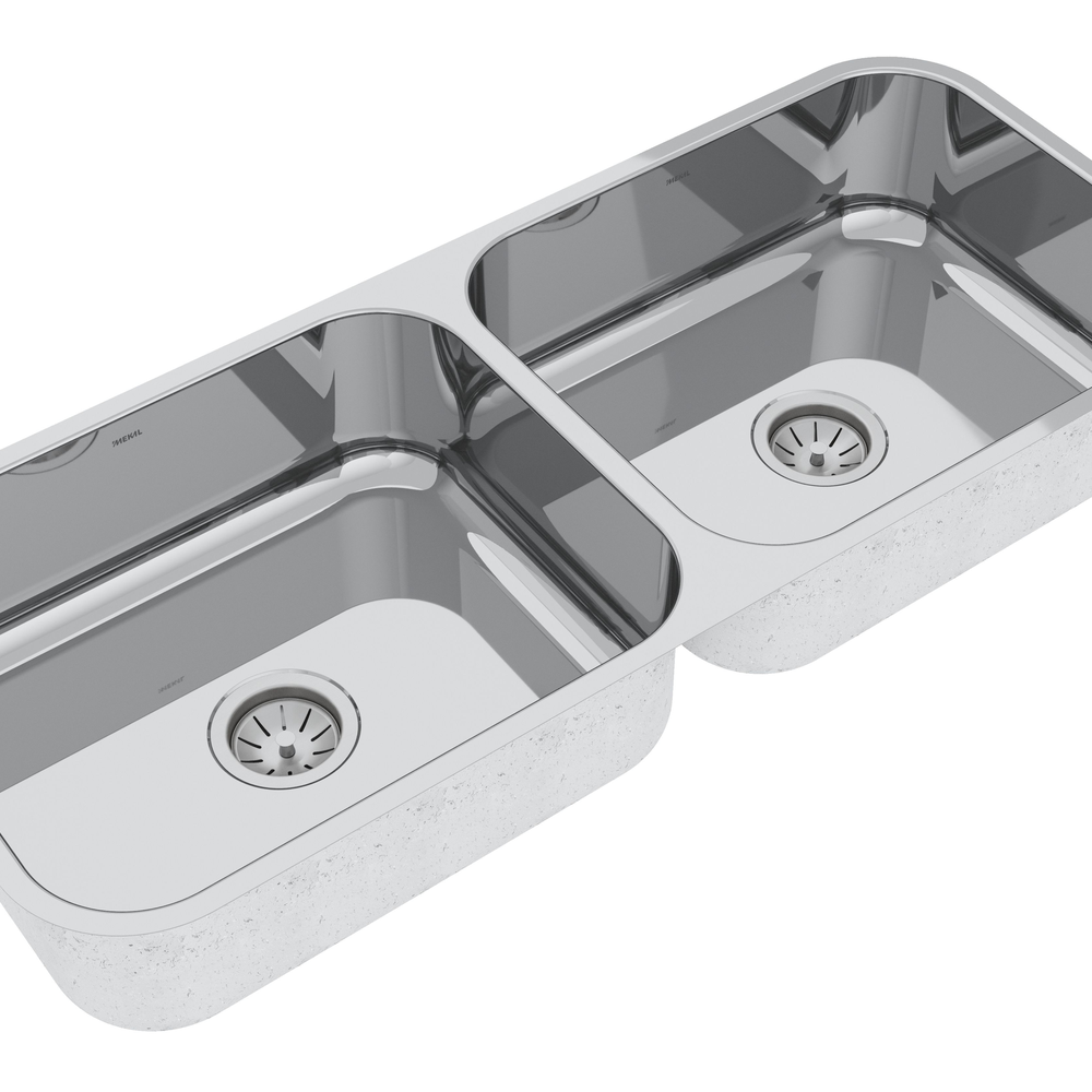 Cuba dupla em aço inox com amplo espaço de uso e variações de profundidade, ideal para cozinhas que buscam praticidade e alta funcionalidade no dia a dia.