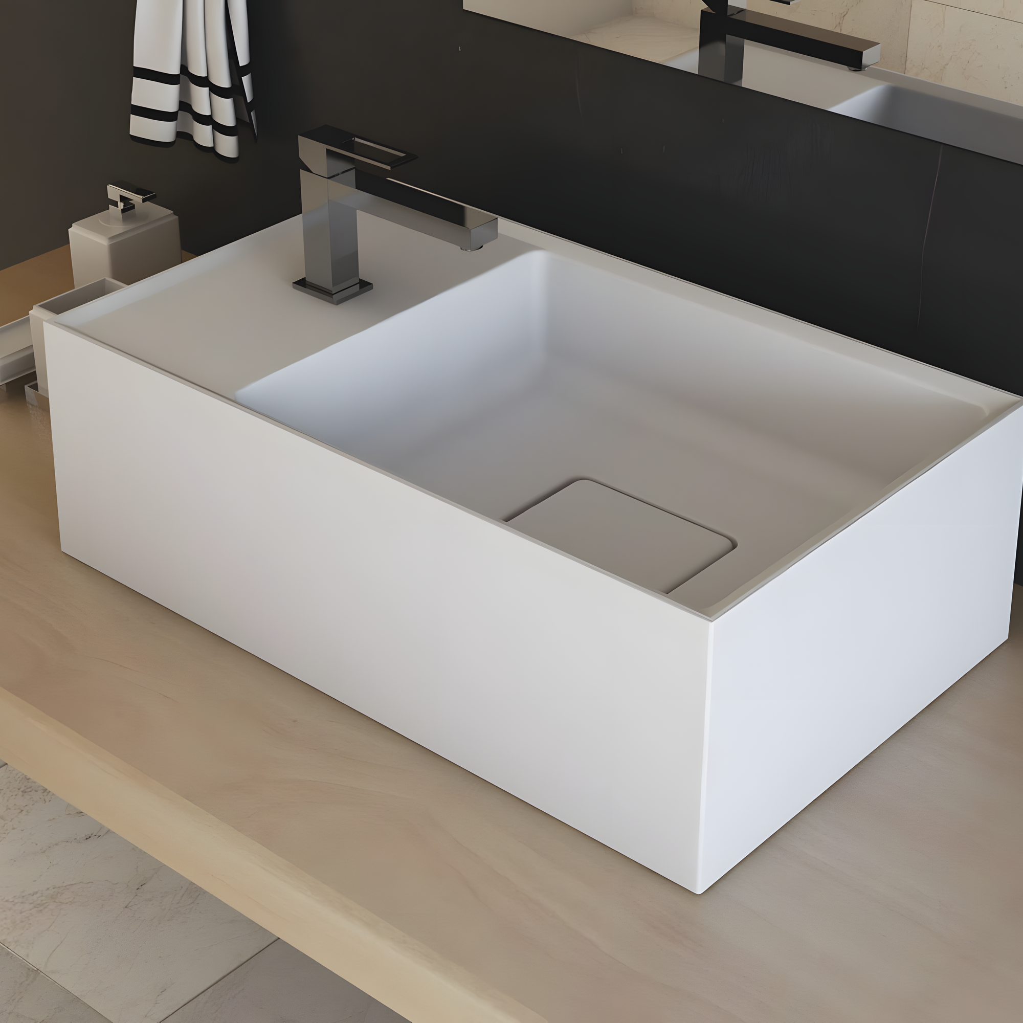 Tecnologia: Duramatt — material Solid Surface com acabamento fosco acetinado, superfície resistente, fácil de limpar e manter.