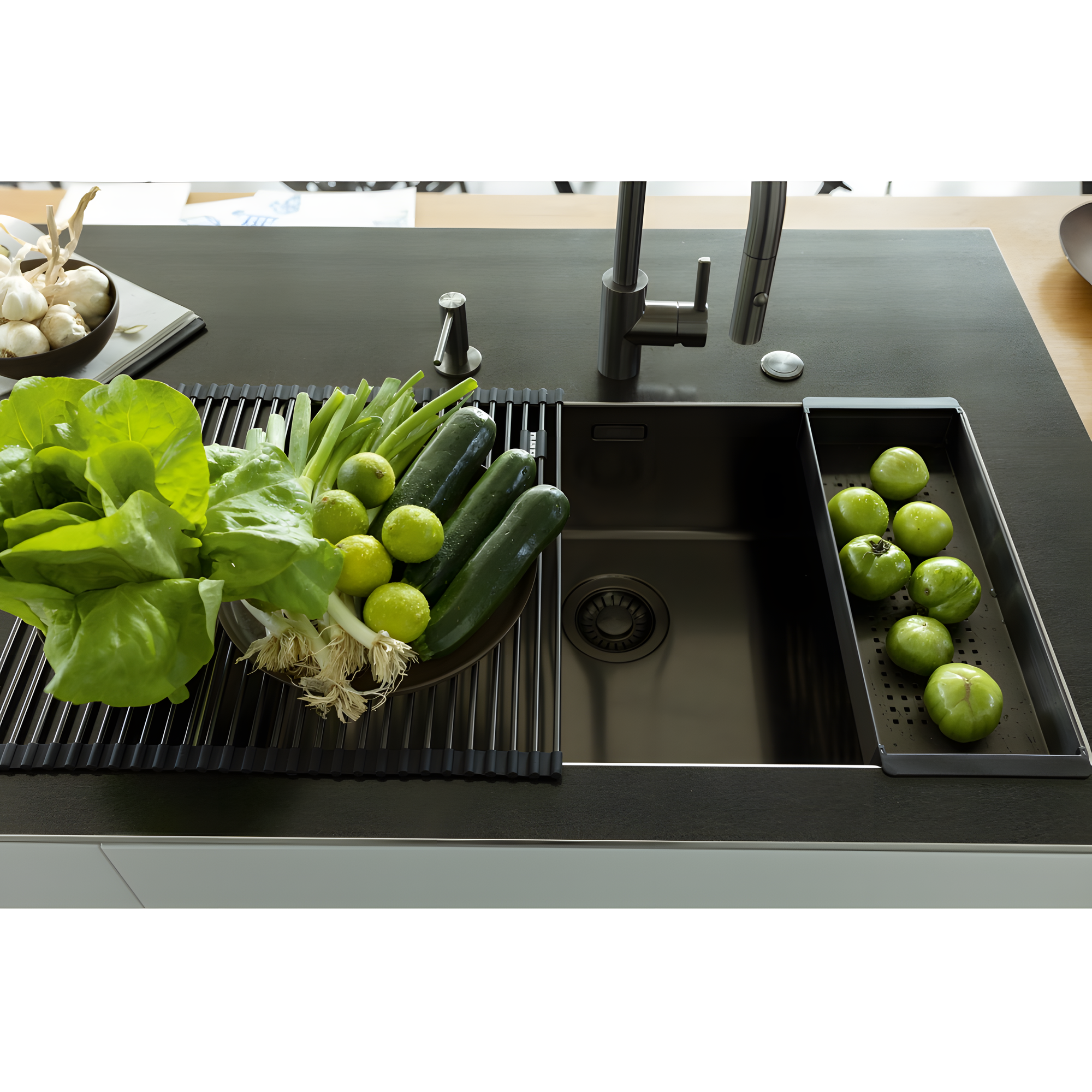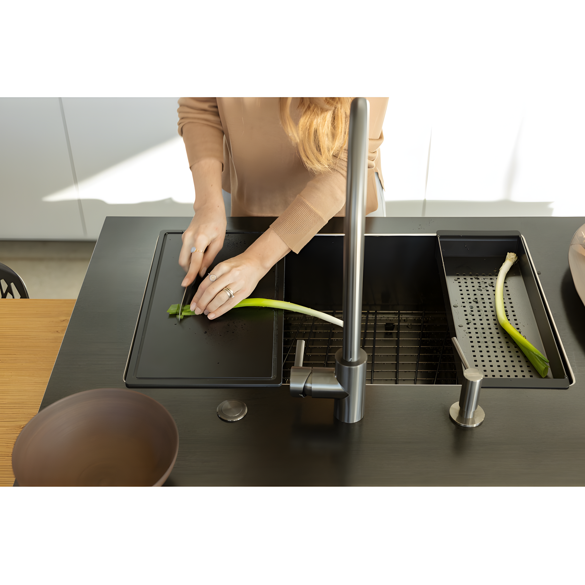 A Cuba Masterpiece Antracite com acessórios da Franke é uma cuba de cozinha em aço inoxidável com acabamento PVD na cor Antracite, projetada para instalação flushmount, slimtop ou submontagem, que combina resistência, design sofisticado e praticidade para ambientes de cozinha modernos e elegantes.
