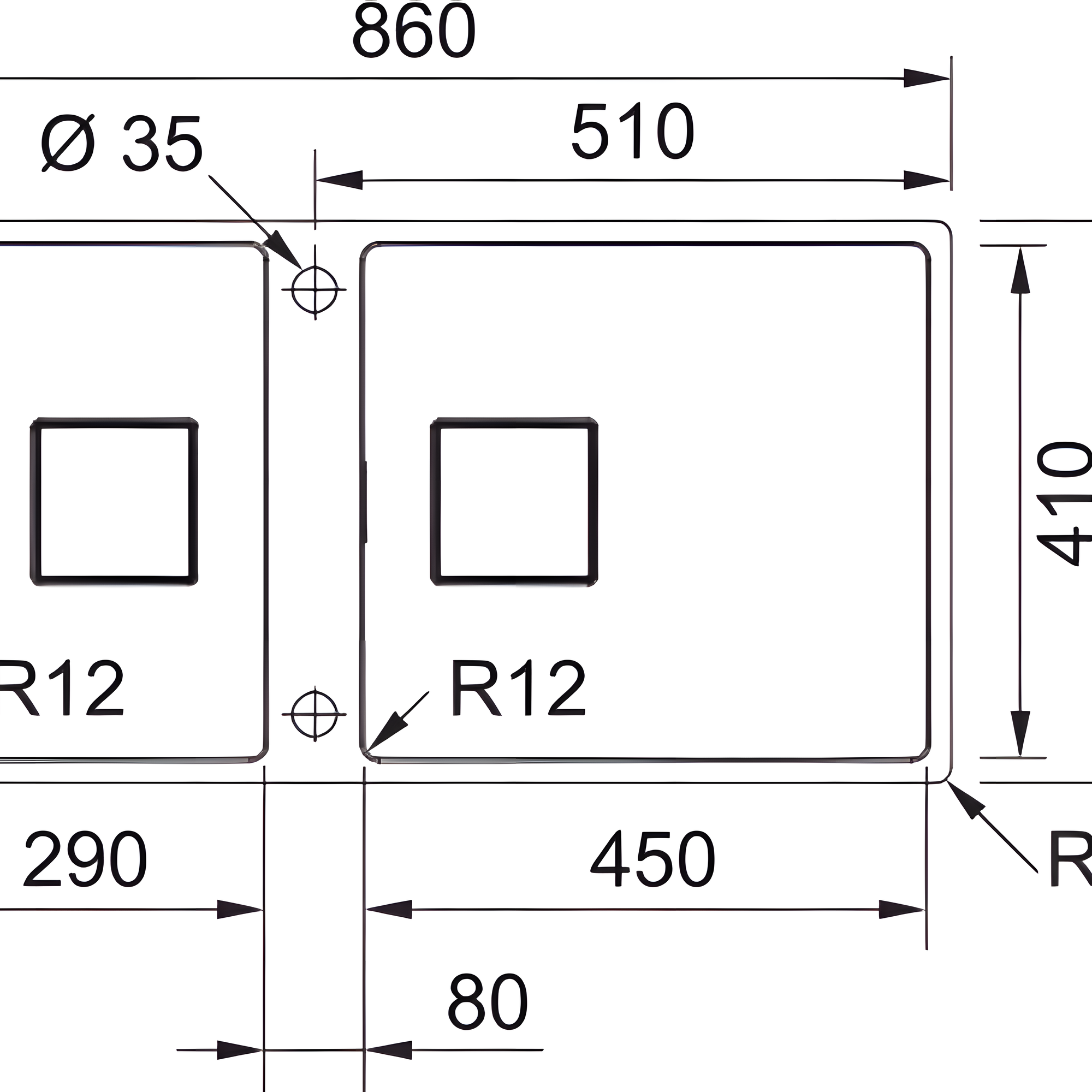 Cuba 1: largura 450 mm × profundidade 410 mm × profundidade útil 200 mm