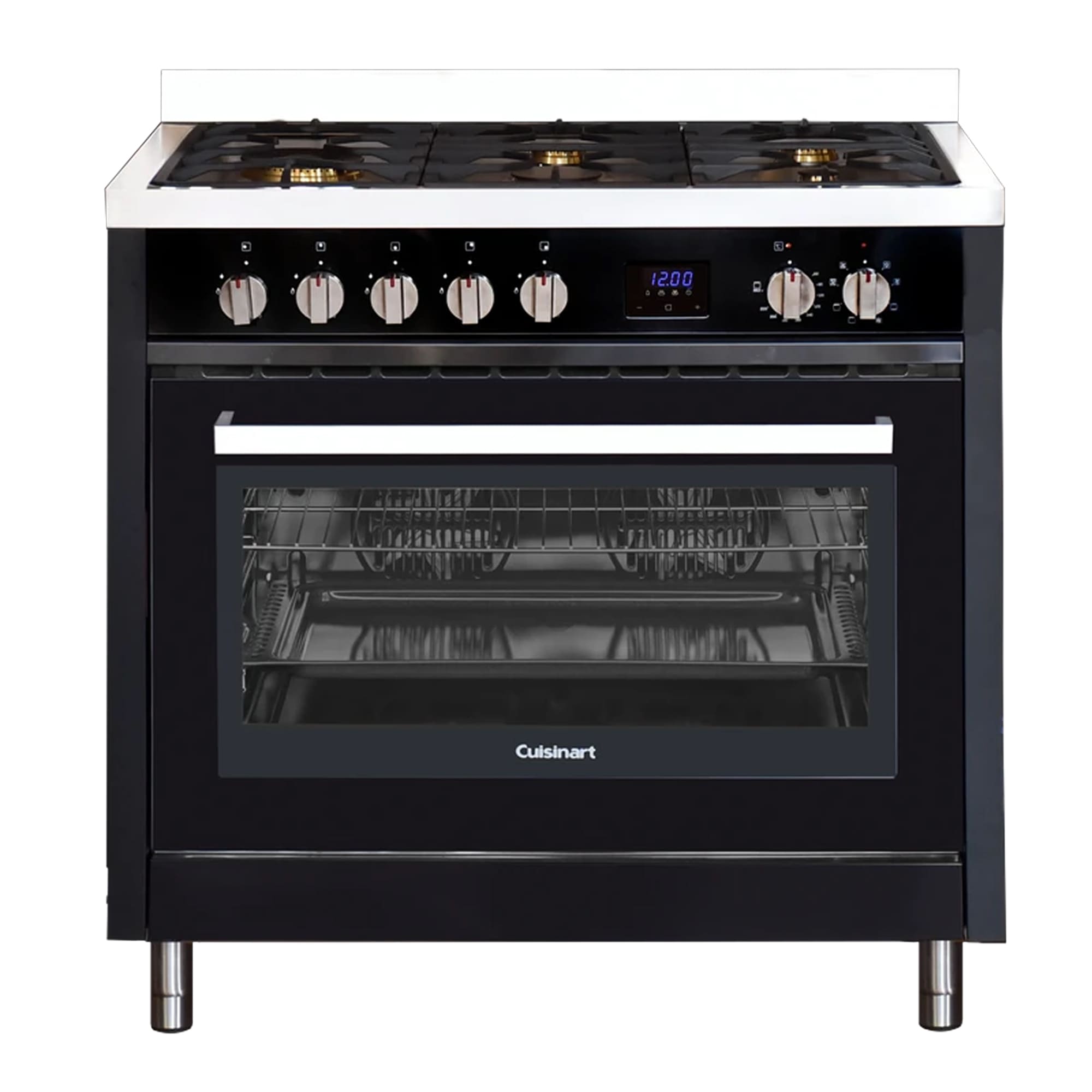 Fogão a gás Cuisinart Arkton com 5 queimadores de alta eficiência e forno elétrico multifunção com 8 modos de cocção, acabamento em aço inox 304 e painel eletrônico com relógio e timer digital. Ideal para cozinhas modernas que buscam desempenho, versatilidade e design sofisticado.