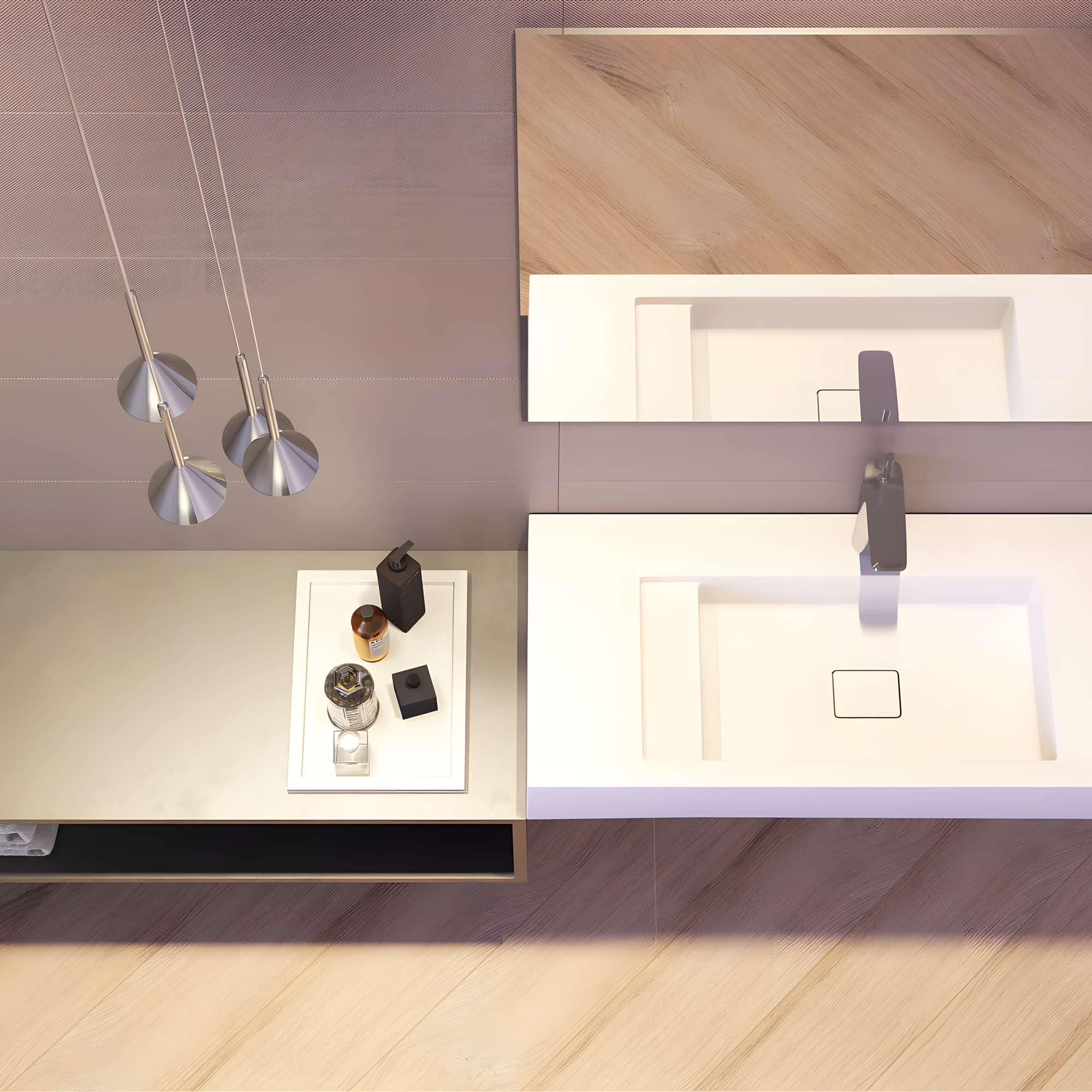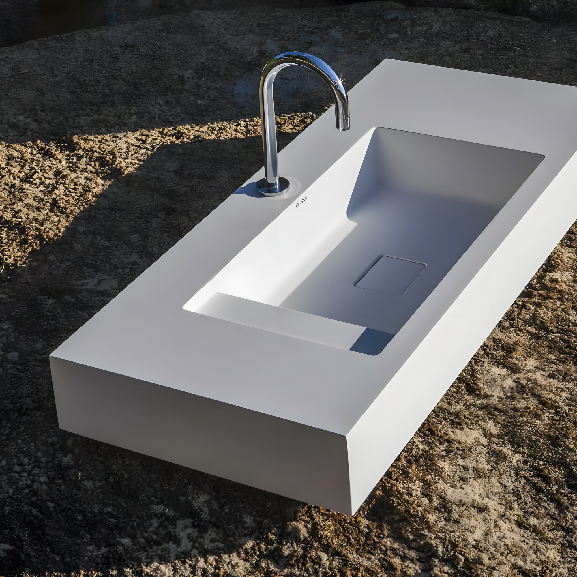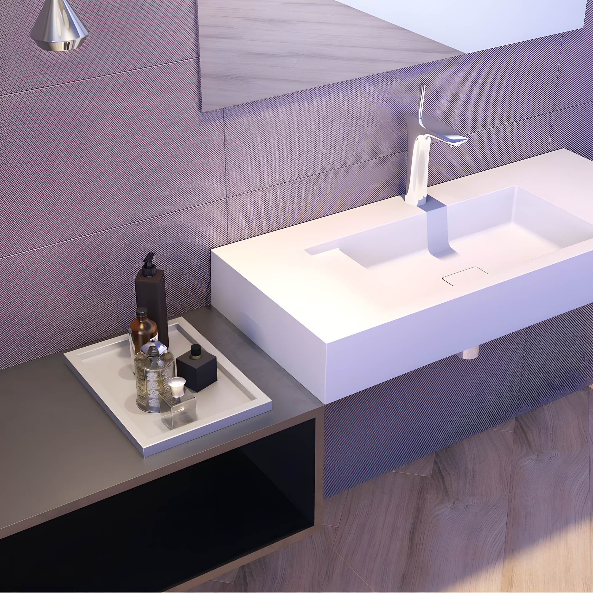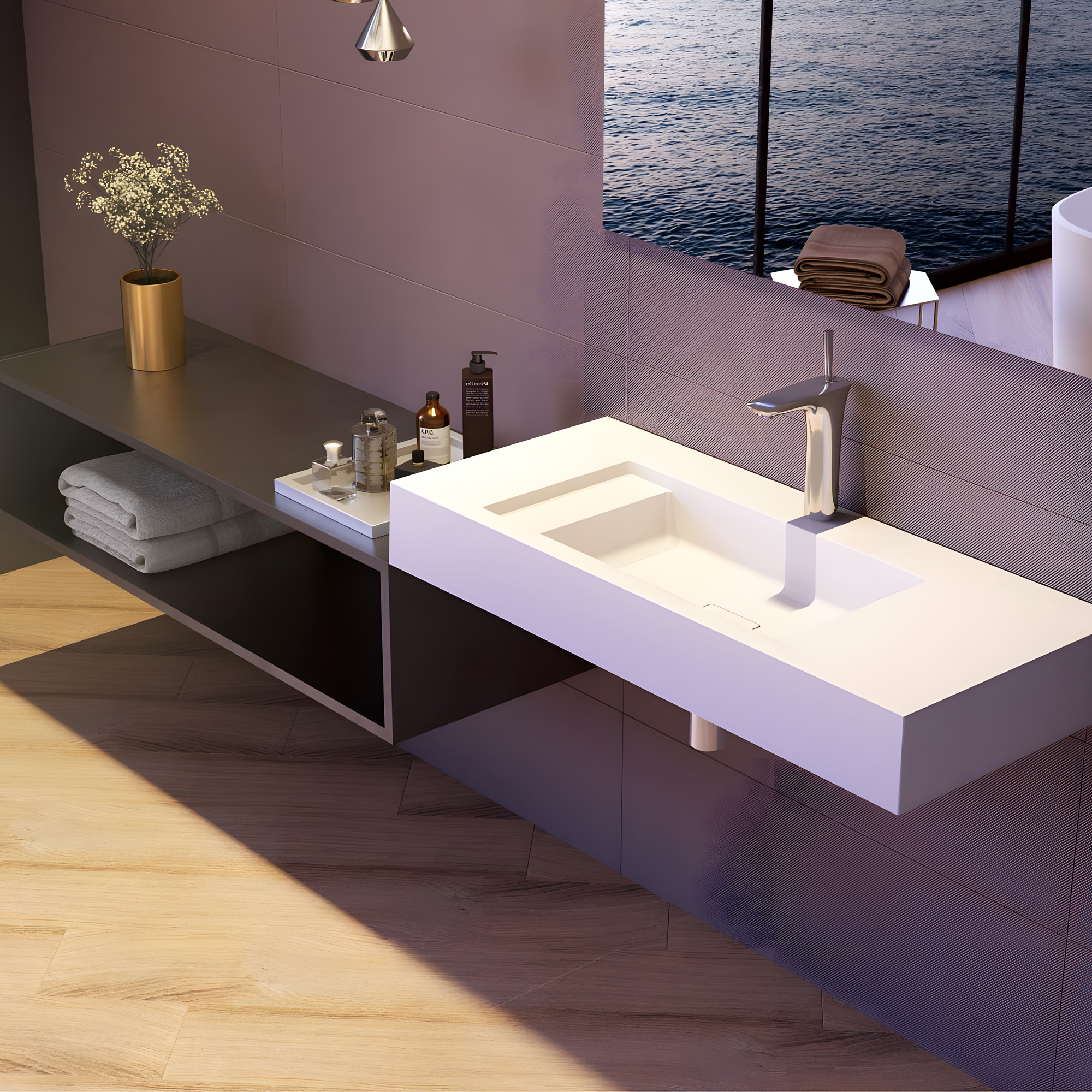 Lavatório com design contemporâneo e generosa superfície de bancada, ideal para projetos que exigem estilo, funcionalidade e amplo espaço de apoio. O visual é minimalista, com linhas expressivas que valorizam o ambiente.