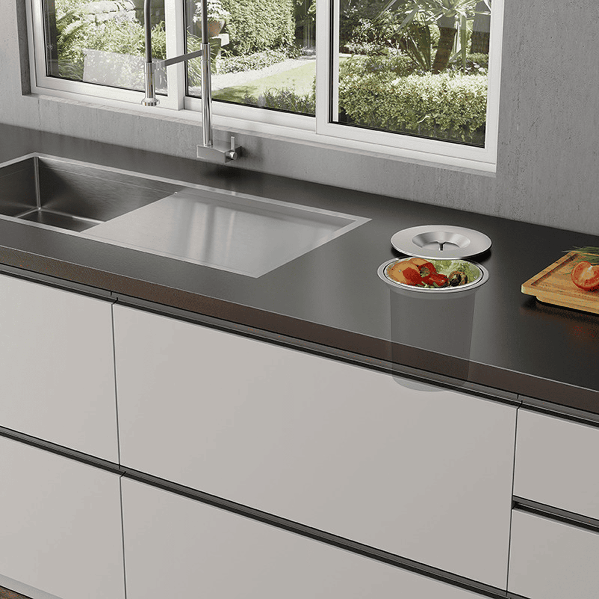 A Lixeira Redonda de Embutir De Bacco foi projetada para oferecer organização e praticidade na cozinha, integrando-se discretamente à bancada ou próximo à cuba. Ela é confeccionada em aço inox acetinado com acabamento que combina com diferentes materiais como granito, mármore ou superfícies sólidas. A lixeira tem capacidade de 5 litros, o que atende às necessidades de descarte de resíduos leves no uso diário. A tampa em aço inox acetinado e os aros internos permitem ajuste adequado da tampa e ajudam a reduzir a liberação de odores, mantendo o ambiente mais limpo. O balde interno em plástico polipropileno é removível, facilitando o esvaziamento e a limpeza do recipiente, o que torna o uso mais higiênico e prático.